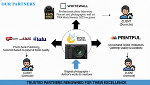 Pour leur production, je m’entoure de partenaires reconnus pour leur savoir-faire et la qualité de leurs réalisations : WhiteWall, laboratoire photo professionnel de renommée internationale; Lulu, Print.com et Saal Digital (pour l'impression des livres photos poèmes), sélectionnés en fonction du type de papier et du niveau de finition; Printful, spécialisé dans l’impression et la fabrication d’objets personnalisés (vêtements, mugs), avec une exigence constante en matière de qualité et de durabilité.