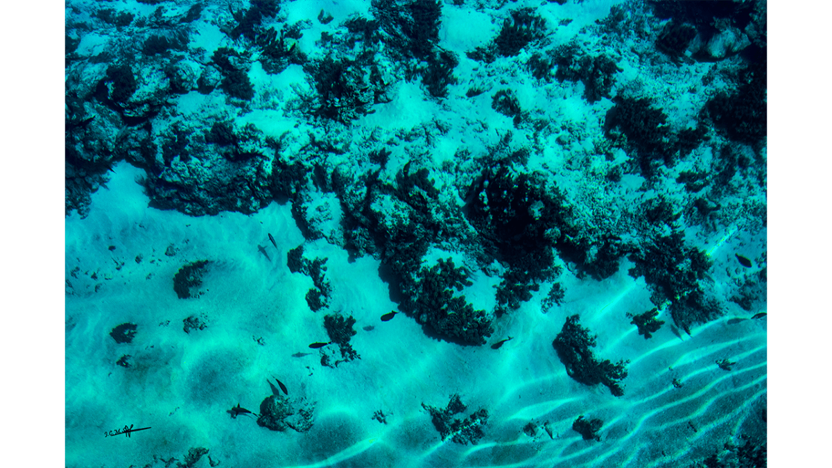 Sous les eaux cristallines, Lumières du Sable dévoile un spectacle hypnotique, imprimé en direct sur aluminium Dibond. Des coraux sombres se dressent au milieu de fonds sableux éclairés par des reflets turquoise, où chaque vague trace des motifs délicats.