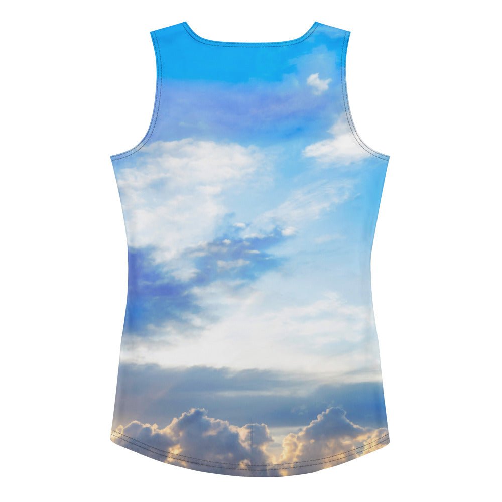 Ce débardeur près du corps met en scène un superbe ciel baigné de lumière, où se mêlent nuances de bleu, éclats dorés et nuages délicatement texturés. L’imprimé apporte une sensation d’élévation et de douceur, comme une parenthèse aérienne dans votre garde-robe. Confortable, extensible et parfaitement ajusté, il allie style poétique et performance textile.