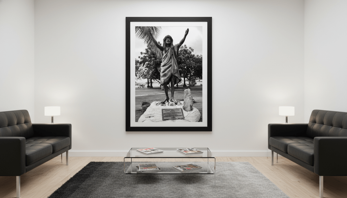 Ce tirage photo Fine Art avec texture, Souffle Polynésien, capture la force et la sérénité d’une statue levée vers le ciel, symbole d’unité et de spiritualité. Le papier texturé renforce la matière de la sculpture et la douceur du décor environnant.