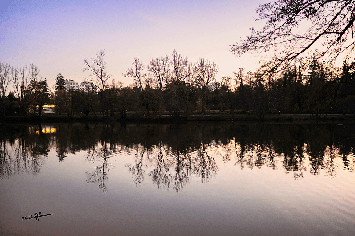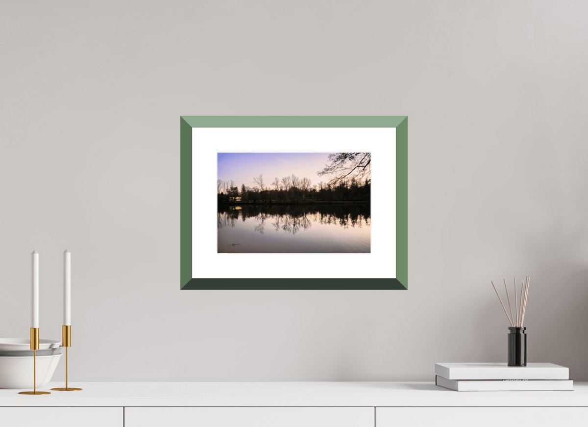 Ce tirage photo Fine Art Fuji Crystal avec cadre, intitulé Reflets d’Automne, saisit la quiétude d’un soir où la lumière se retire doucement derrière les arbres. Les silhouettes nues se mirent dans l’eau paisible, tandis que le ciel dégrade ses teintes de lavande et de rose pâle.