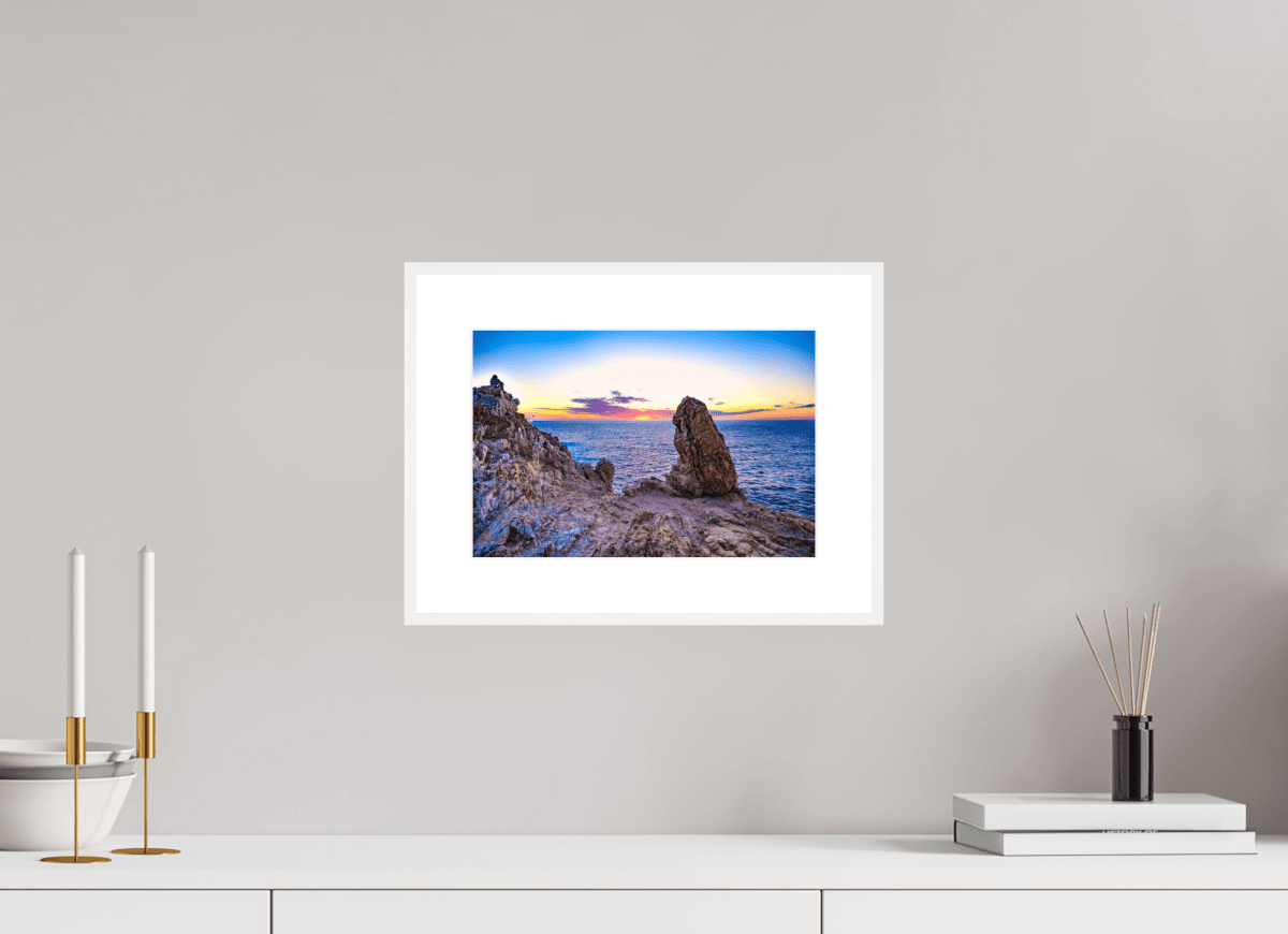Le tirage photo Fuji Crystal avec cadre, Soupir Doré, met en scène la lumière dorée qui enveloppe la côte au crépuscule. L’encadrement valorise la composition et la profondeur pour un rendu intemporel et apaisant.