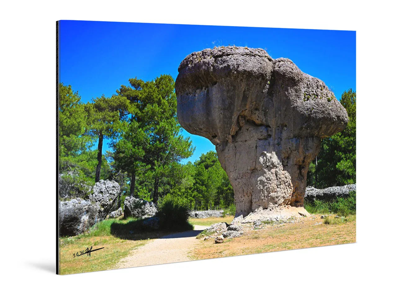 Découvrez Courbe des Âges sur plexiglas, où la brillance du support révèle la puissance et la beauté de la roche sculptée par les siècles. Les teintes chaudes de la pierre et les verts profonds des pins sont intensifiées par la luminosité du plexiglas, donnant une impression de profondeur et de relief saisissant.