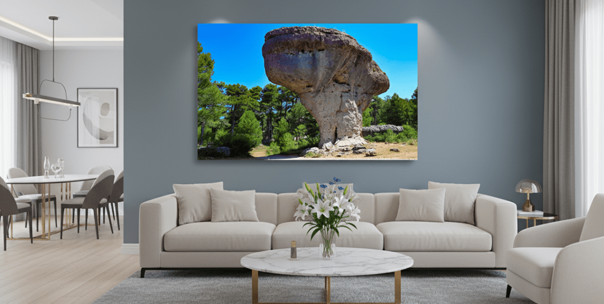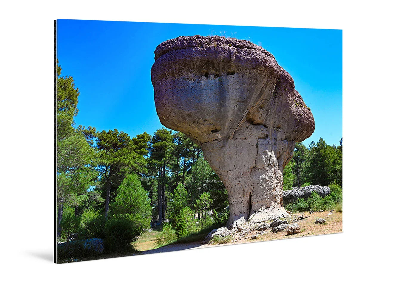Découvrez Couronne de Pierre sur plexiglas, un tableau où la lumière danse sur les reliefs de la roche et les contours de la couronne naturelle. La surface brillante amplifie les teintes chaudes de la pierre et la densité lumineuse des pins verdoyants, donnant un effet de profondeur et un éclat vivant qui attire le regard.