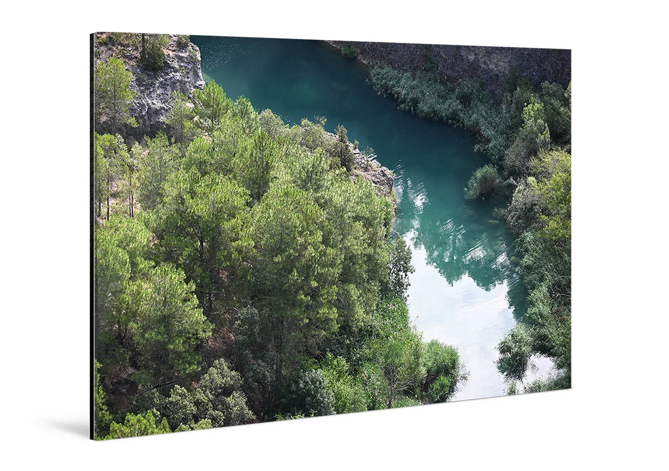 Avec Là où Dort le Silence sur plexiglas, la lumière devient un élément vivant du tableau décoratif. Les reflets du cours d’eau émeraude et les falaises verdoyantes prennent une intensité unique grâce à la brillance du plexiglas, créant un effet de profondeur et d’immersion saisissant. Chaque détail, des ondulations de l’eau aux feuilles des arbres, semble flotter dans l’espace, invitant à un moment de contemplation et de calme absolu.