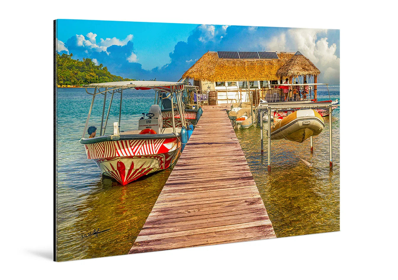 Avec L’Écho du Ponton sur plexiglas, la scène marine prend des allures éclatantes. L’eau cristalline gagne en profondeur et en luminosité, tandis que les couleurs vives des bateaux se révèlent avec intensité. Le ponton et la cabane semblent presque flotter hors du cadre, comme suspendus dans la transparence du support.