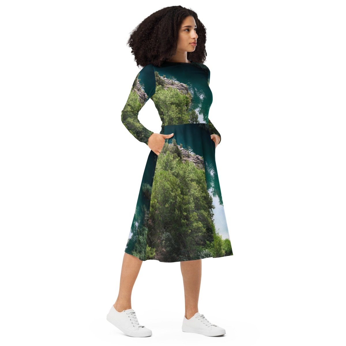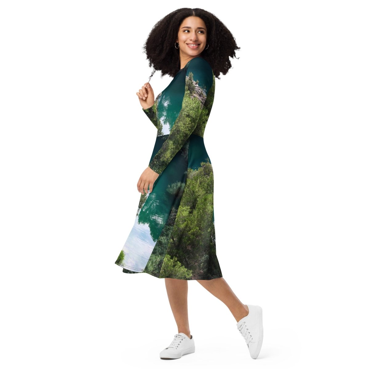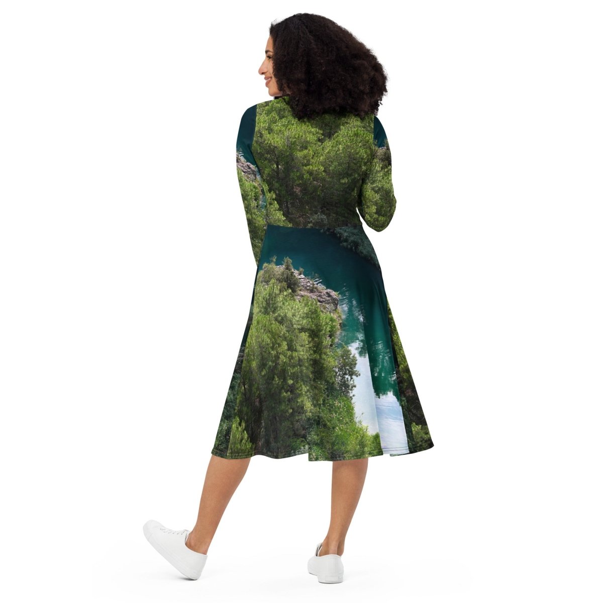 Imaginez-vous enveloppée dans un tissu doux comme une caresse, sublimée par une coupe fluide. Cette robe célèbre la nature avec son imprimé enchanteur qui évoque forêts verdoyantes et horizons lumineux, une véritable bouffée d’air frais à porter.