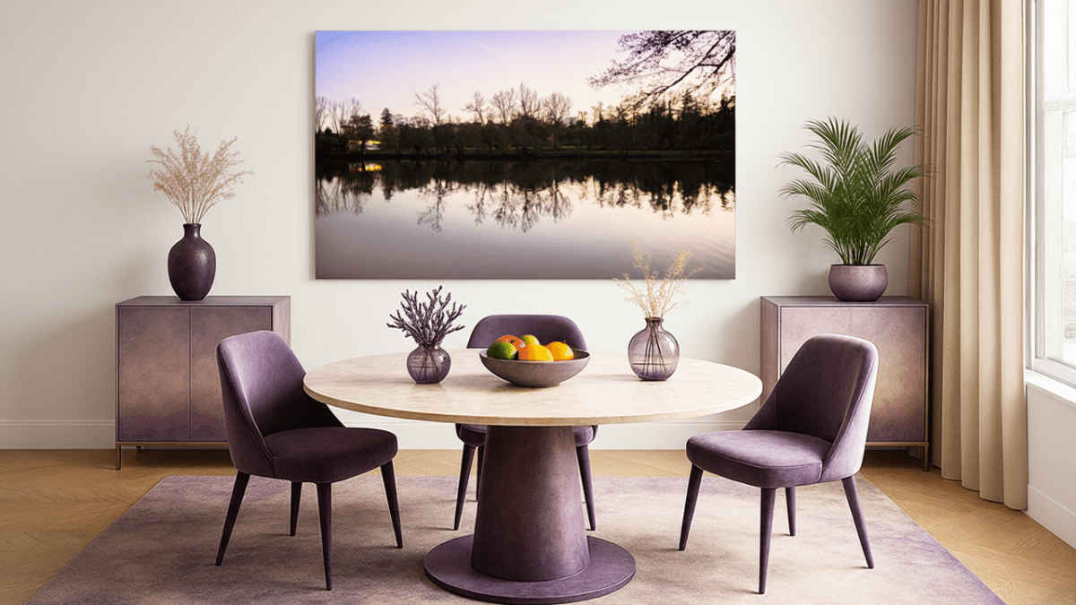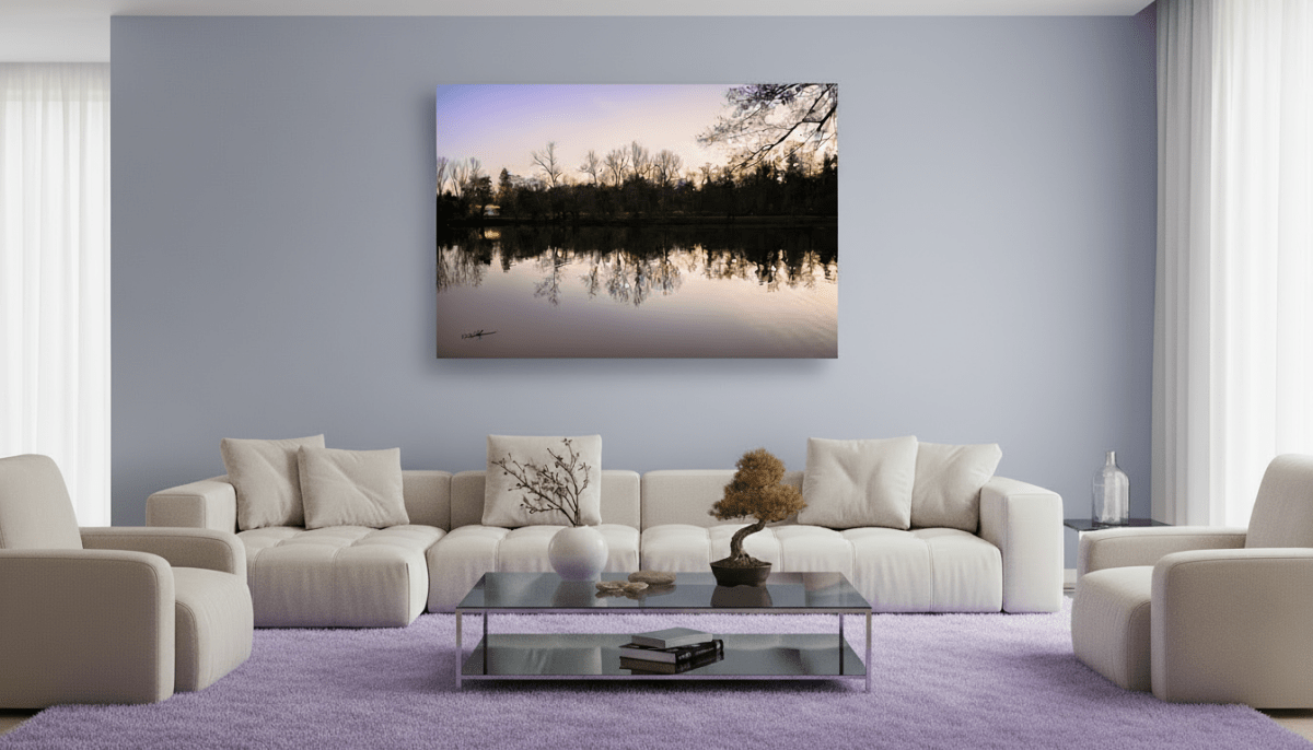 Quand le jour s’efface lentement, le paysage s’habille d’une lumière douce et feutrée. Ce tableau décoratif sur aluminium immortalise ce moment suspendu où la nature se reflète avec une précision silencieuse. Les arbres se dessinent sur l’eau calme, le ciel s’adoucit, et l’ensemble dégage une sérénité subtile et élégante.