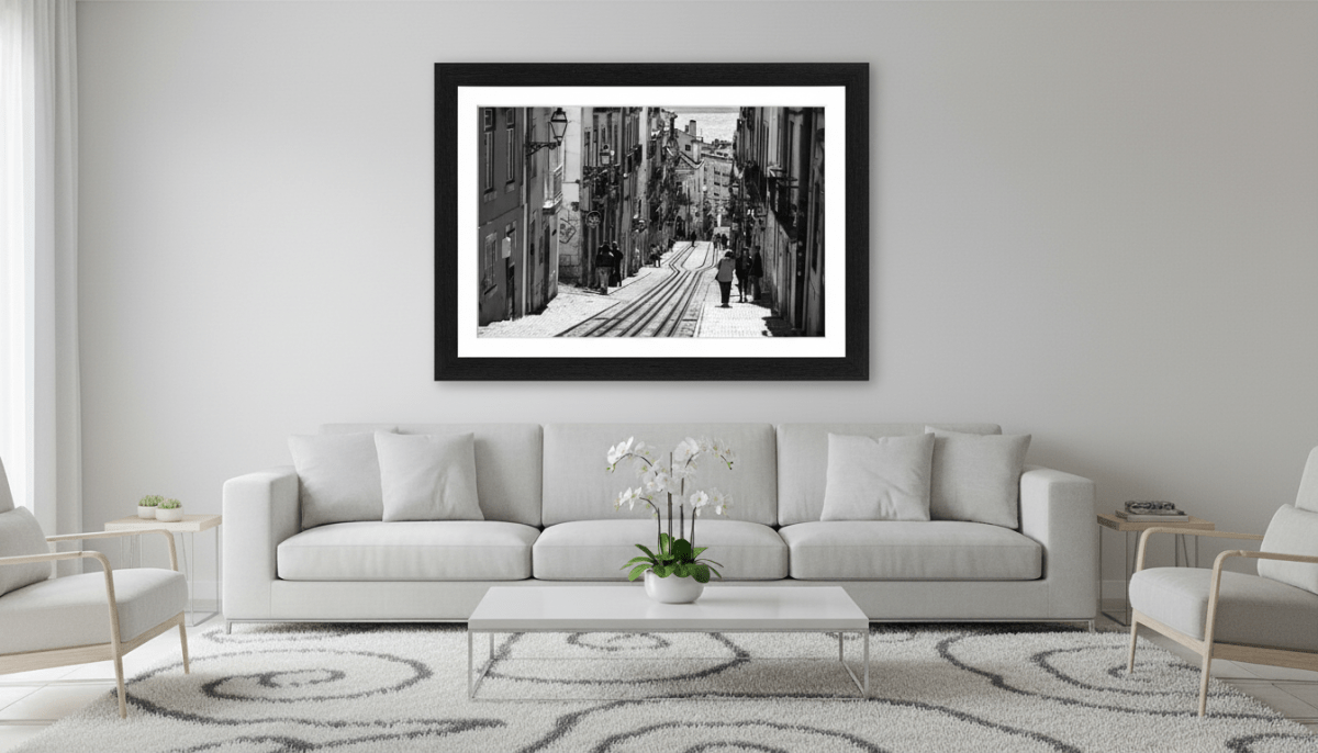 Ce tirage photo Fuji Crystal, Les Lignes du Temps, offre un noir et blanc d’une grande clarté. Le procédé Fuji Crystal restitue fidèlement les contrastes et la lumière, mettant en valeur les perspectives profondes et la géométrie de la rue.