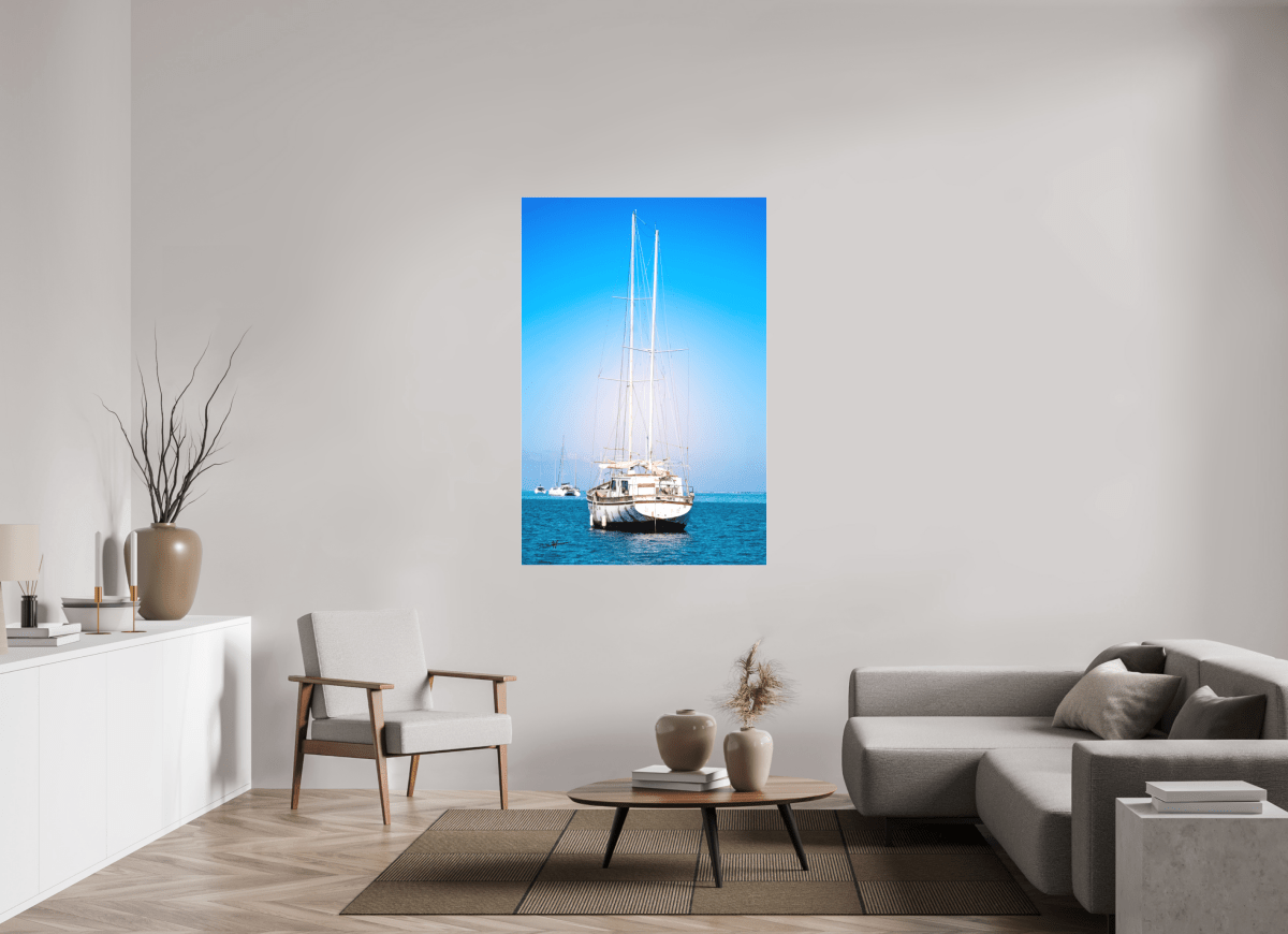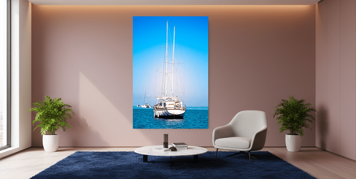 Auf hochwertigem Plexiglas gedruckt gewinnt das Bild an Intensität und Tiefe. Die Details des Bootes, die Flüssigkeit des Wassers, die Klarheit des Himmels: jedes Element hebt sich mit beeindruckender Schärfe ab. Die glänzende Oberfläche verstärkt die Eleganz des Ganzen und vermittelt den Eindruck von Tiefe, fast wie ein offenes Fenster zum Meer.