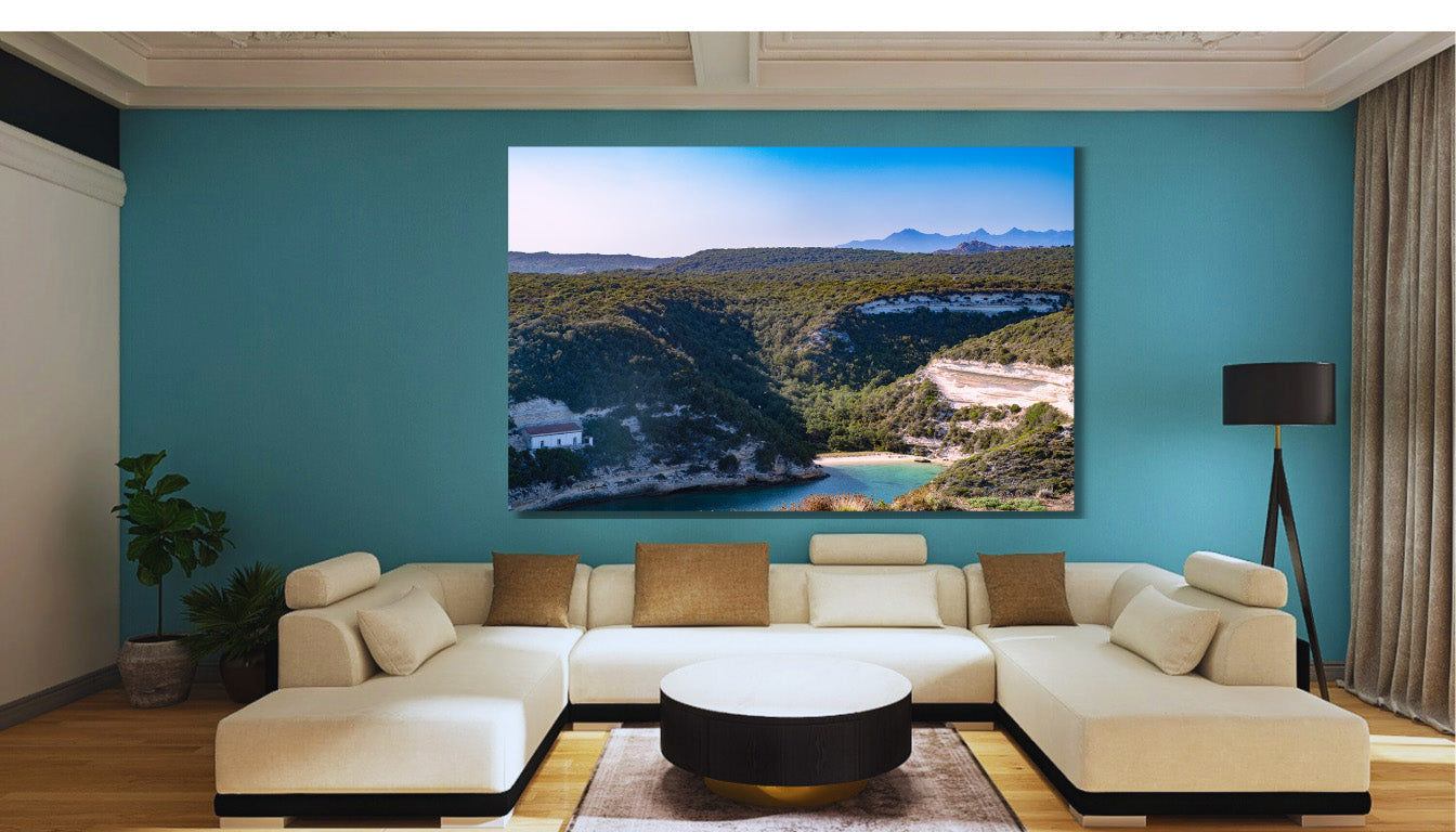 Beleuchten Sie Ihr Interieur mit dem Bild "Neue Klarheit" auf Plexiglas, wo sich das Mittelmeer mit Glanz und Transparenz offenbart. Die grünen Täler, die vom Licht durchfluteten Berge und das türkisfarbene Meer zeigen sich mit außergewöhnlichem Glanz und Klarheit, als würden Sie durch ein offenes Fenster in den Süden blicken.