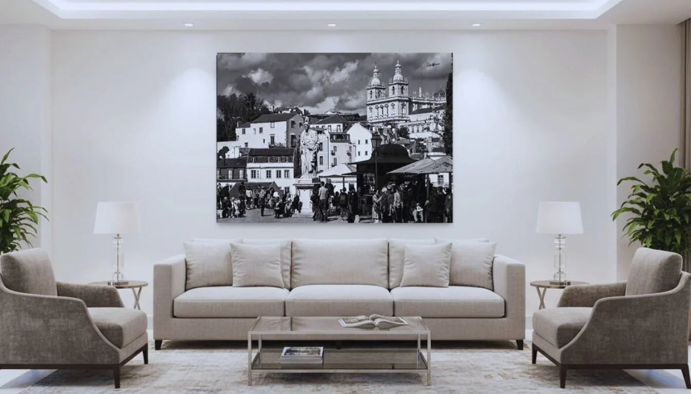 Mit Das Herz des Dorfes auf Leinwand verschmelzen alle Schattierungen von Schwarz und Weiß mit der feinen Struktur der Leinwand und verleihen der Szene einen malerischen Ausdruck. Der Platz erwacht sanft unter dem Blick: Die Sonne gleitet über die Kuppeln, die Schatten der Vorübergehenden verlängern sich, und die zentrale Statue bewahrt ihr Geheimnis.