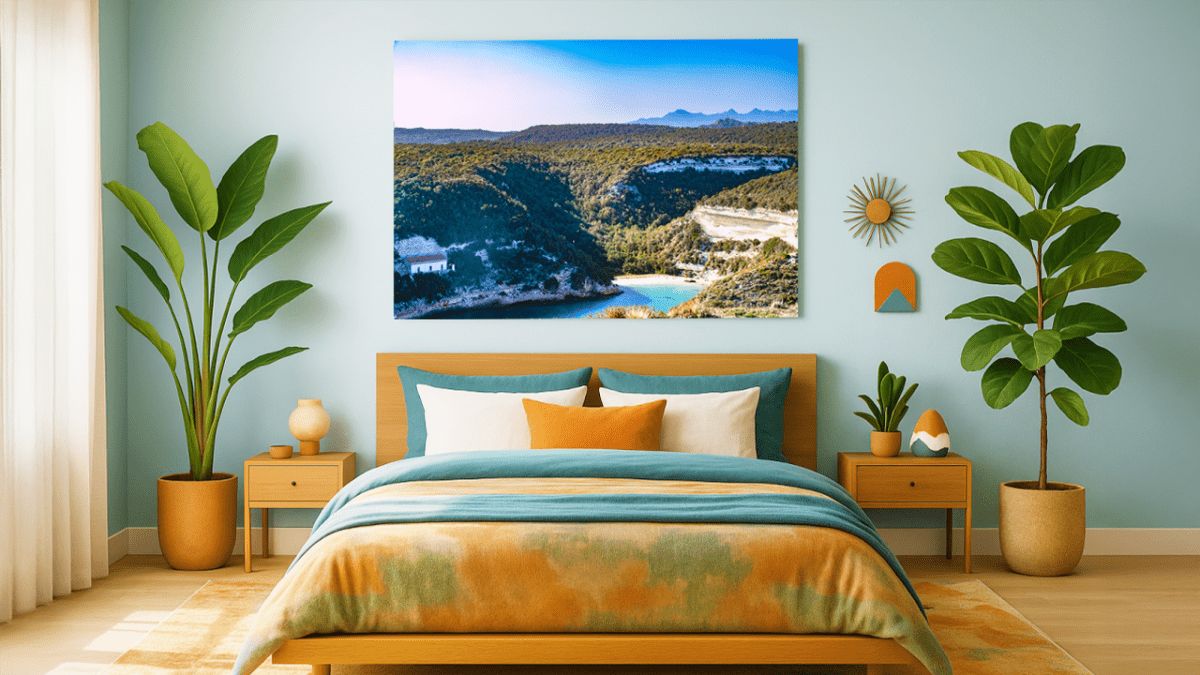 Dieses Wandbild eignet sich ideal für Wohnzimmer, Schlafzimmer oder Arbeitsbereich und vereint moderne Eleganz mit einer beeindruckenden visuellen Wirkung. Es ist robust und dennoch leicht, einfach anzubringen und wird zum Blickfang, der Ihre Wände in Fenster zur mediterranen Landschaft verwandelt.