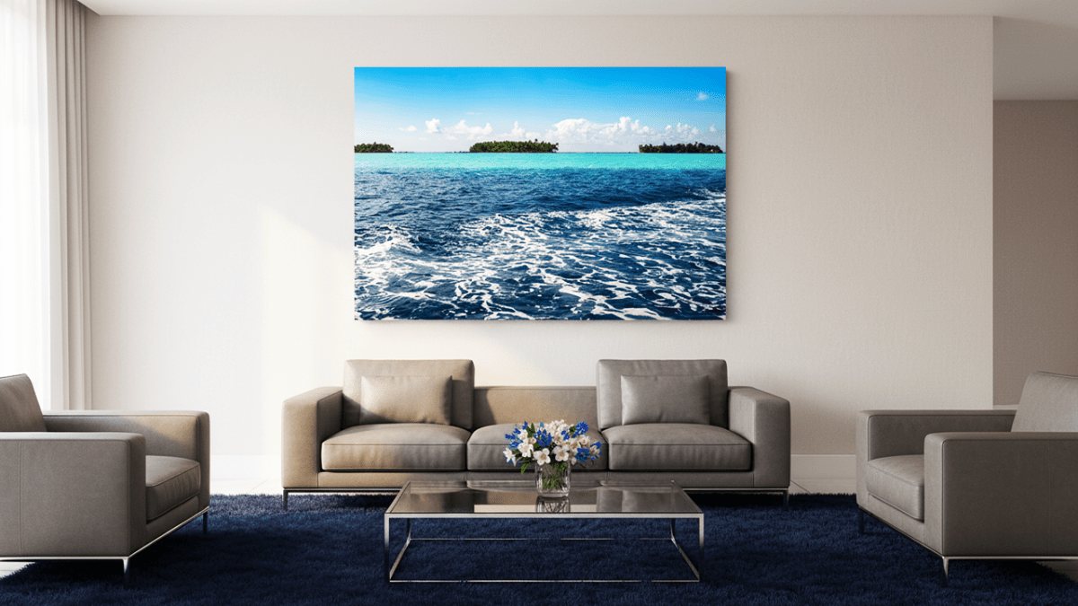Genießen Sie die wilde Schönheit von „Die verstreuten Inseln“, einem dekorativen Druck direkt auf Dibond-Aluminium. Unter einem klaren Himmel mit zarten Wolken ragen grüne Inselchen aus türkisfarbenem Wasser empor, deren Konturen von schimmernden Wellen umspielt werden.