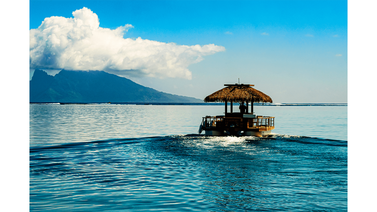 Bewundern Sie „Der Atem der Inseln“, ein dekoratives Gemälde, das live auf Dibond-Aluminium gedruckt wird und die Magie der Natur offenbart. Unter einem Himmel mit leichten Wolken schwebt eine auf Stelzen stehende Hütte auf tiefblauem Wasser und blickt auf grüne Berge, die in der Ferne emporragen.