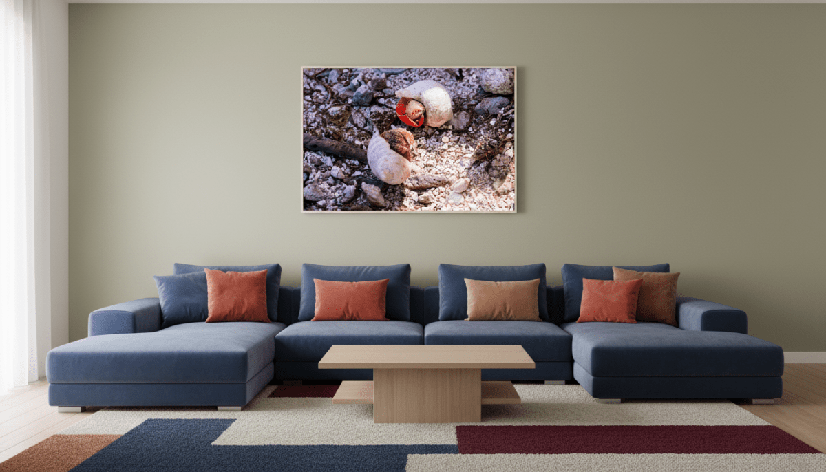 Auf Leinwand verwandelt sich die Szene in ein sanftes und lebendiges Gemälde. Die Farbtöne der Einsiedlerkrebse verschmelzen harmonisch mit Sand und Muscheln und schaffen so ein zartes und poetisches Wandbild. Die subtile Textur des Stoffes verleiht dem Bild eine haptische Dimension und lädt zum Betrachten und Nachdenken ein.
