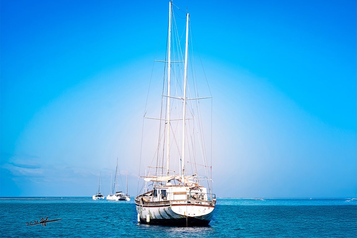 This Fine Art photo print with texture, Repos au Large, captures the serenity of a sailboat still on a peaceful sea. The texture of the paper adds a delicate relief to the water and sky, offering a feeling of calm and escape.