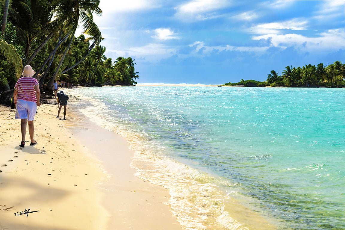 This Fine Art photo print captures the gentleness of a tropical beach, between golden sand and turquoise sea. The footprints left on the shore express a simple feeling, a moment of well-being and calm at the heart of nature.