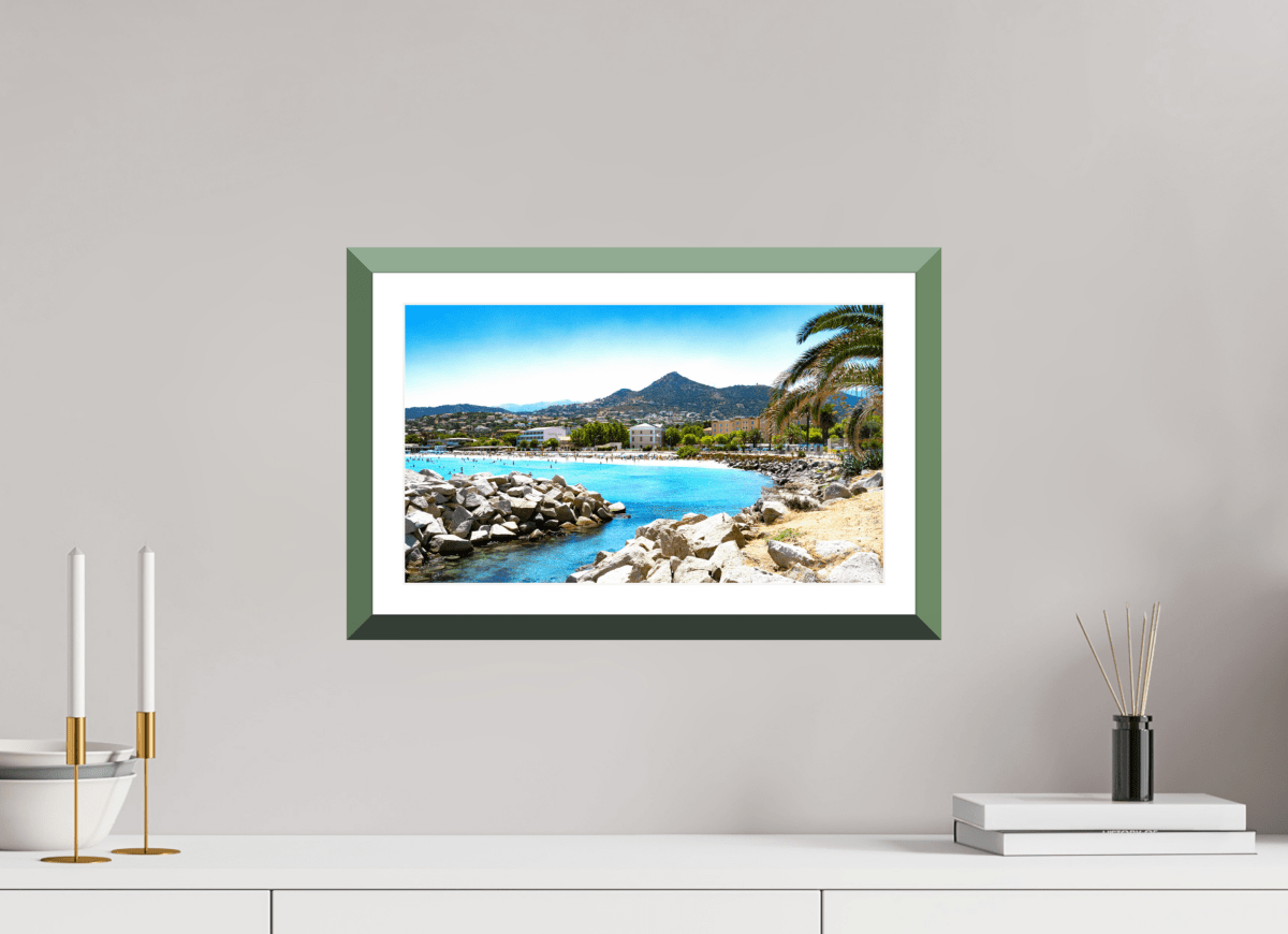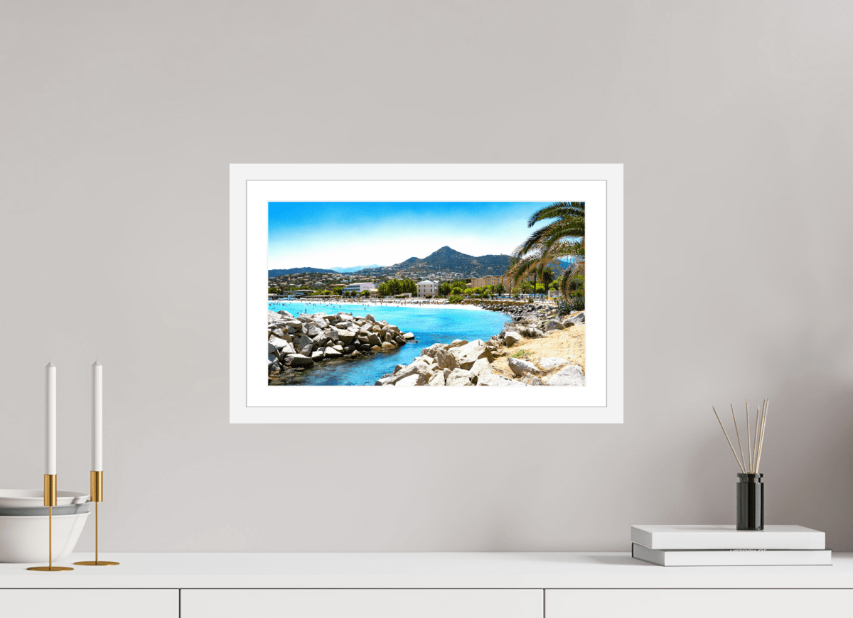 The Fuji Crystal photo print with frame, Isula Rossa, highlights a beach with turquoise reflections and sunlit reliefs. Every detail, from the rocks to the clear sky, is enhanced by the Fuji Crystal process for a brilliant finish with remarkable depth. The aluminum or plexiglass frame completes this work with timeless elegance.
