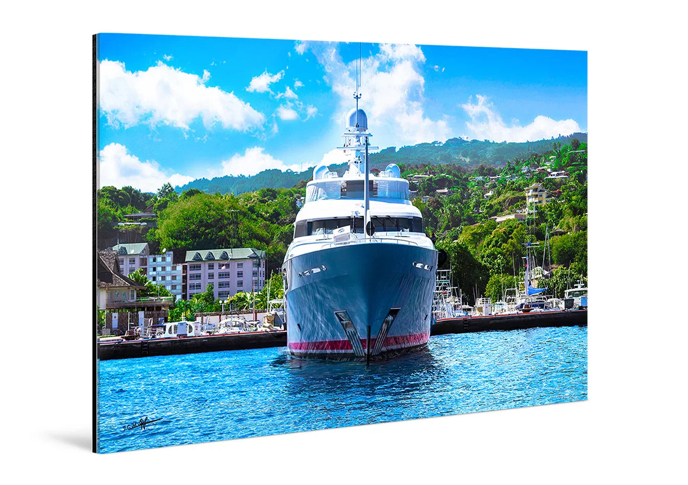 Acrylic glass (plexiglass) glossy available in three thicknesses (2 mm, 4 mm, or 6 mm): brightness and visual depth; Back: Dibond aluminum plate; lightweight, stiff, and unbreakable frame; Ready to hang