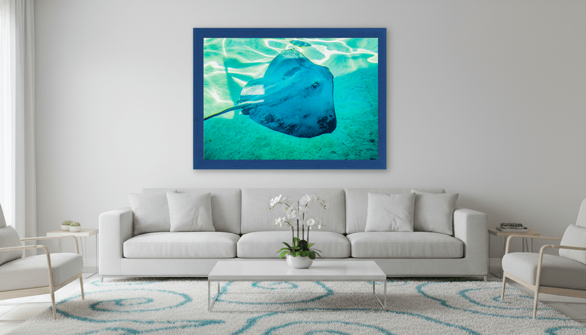 Ce tirage photo Fuji Crystal, vous plonge dans les profondeurs lumineuses d’une mer turquoise où une raie évolue avec une grâce silencieuse. La scène, baignée de clarté et de reflets mouvants, capture la beauté apaisante du monde sous-marin. Chaque détail respire la fluidité et la sérénité de l’océan. Grâce à la technologie Fuji Crystal, les dégradés de bleu se révèlent avec une intensité remarquable, offrant un rendu à la fois précis, lumineux et empreint de douceur. Une œuvre contemporaine qui invite à la contemplation et à l’évasion.