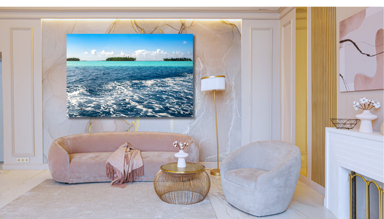Con Las Islas Dispersas sobre plexiglás, el océano adquiere una dimensión brillante y luminosa. El brillo del soporte intensifica los reflejos turquesa y acentúa la profundidad de las olas, ofreciendo una impresión de realismo impactante. Los islotes parecen casi flotar fuera del marco, suspendidos en una luz cristalina.