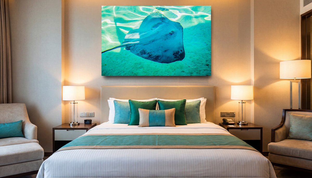 Bajo la superficie transparente, una raya se desliza con una elegancia silenciosa. El cuadro decorativo "Cerúleo" sobre plexiglás captura la gracia de ese instante submarino, donde la luz acaricia la arena y se mezcla con los reflejos turquesa. Cada movimiento parece suspendido, cada matiz respira la serenidad de las profundidades.