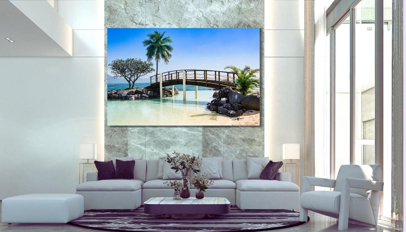 Perfecto para una sala, un dormitorio o un despacho, El Puente de la Calma sobre plexiglás aporta a su decoración mural modernidad y atmósfera serena, conservando la suavidad y el escape que solo una escena tropical puede ofrecer.