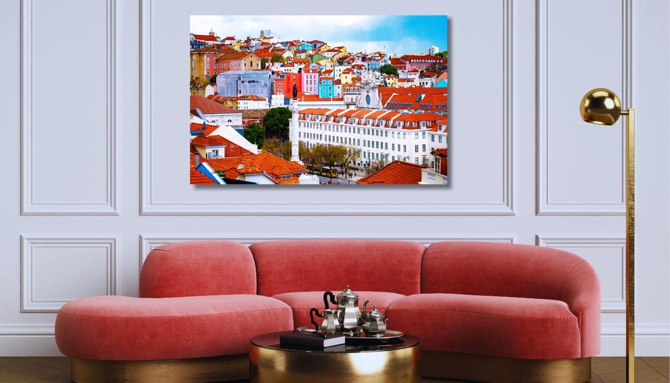 Bajo el brillo cristalino del plexiglás, la ciudad se revela como un mosaico vivo. Los tejados rojos, las fachadas coloridas y los muros multicolores parecen bailar con la luz, cada matiz vibrando como una nota en una sinfonía cromática. El soporte brillante amplifica esta intensidad, dando la impresión de que la ciudad respira, bañada en un resplandor siempre cambiante.