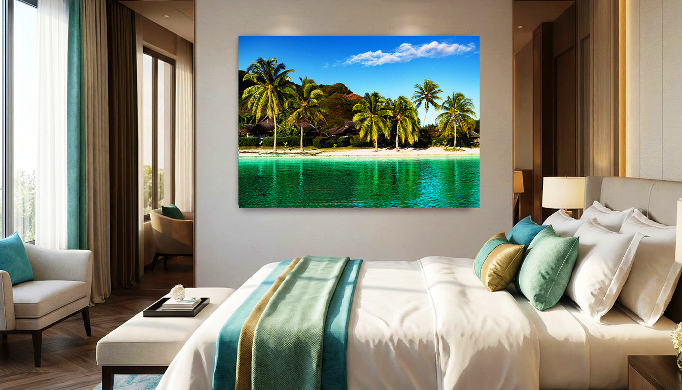 L’aluminium, à la fois solide et lumineux, met en valeur les verts des palmes et les reflets de la mer, créant un effet saisissant. Que ce soit dans une chambre ou un salon, il évoque les vacances éternelles et la douceur d’un rivage parfait. Les couleurs vives et la symétrie naturelle apportent une harmonie apaisante.