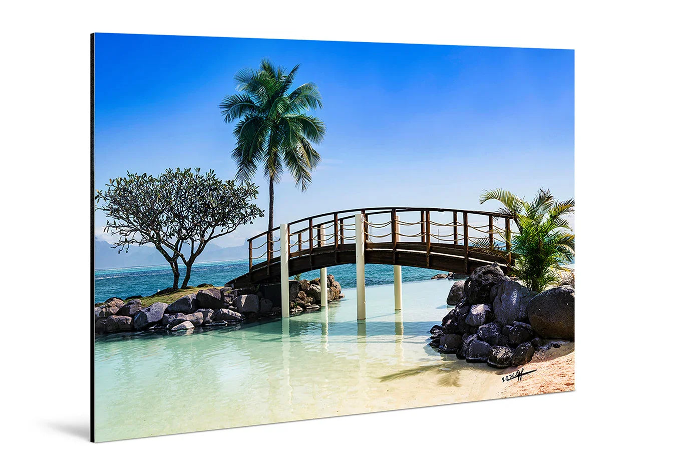Avec Le Pont du Calme sur toile, la scène devient un tableau vivant où la douceur des couleurs et la texture subtile de la toile créent un rendu pictural chaleureux et apaisant. Le pont en bois semble inviter le regard à traverser l’eau turquoise, tandis que les palmiers oscillent comme dans une danse lente avec la brise.