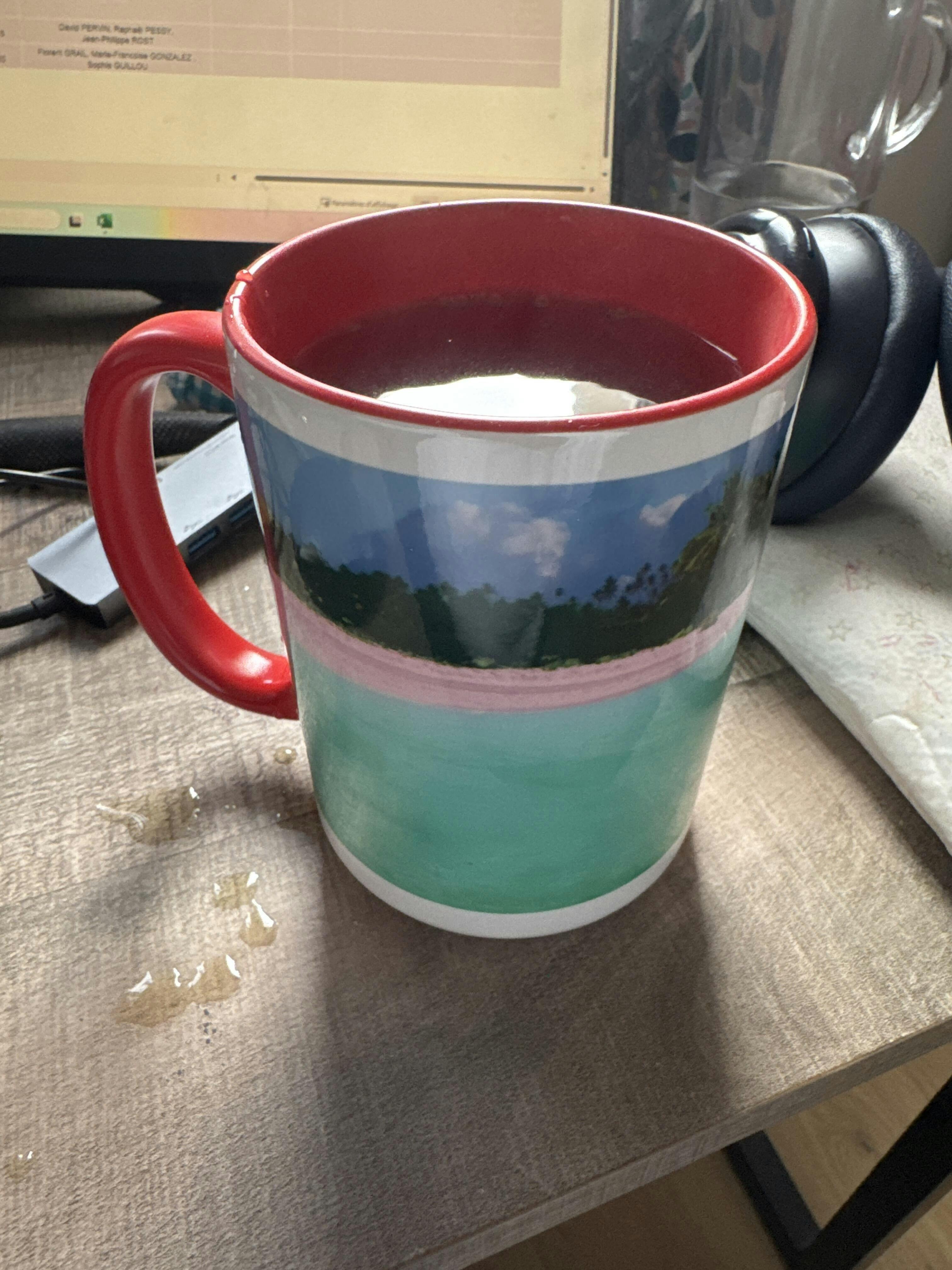 À chaque fois que je regarde cette tasse mon esprit est apaisé. Je me projette sous les palmiers , le temps s'arrêtant et la seringue commence. C'est une tasse idéal pour les pause café