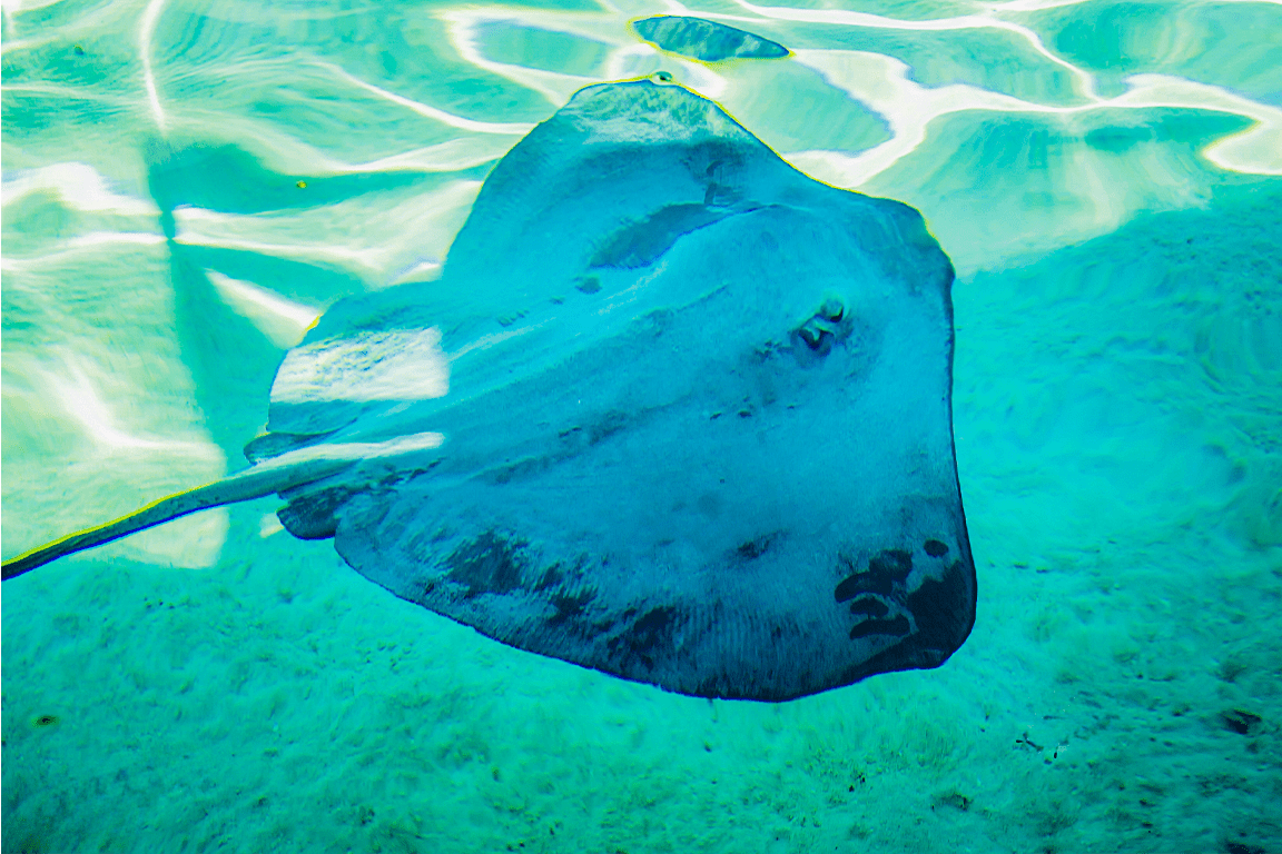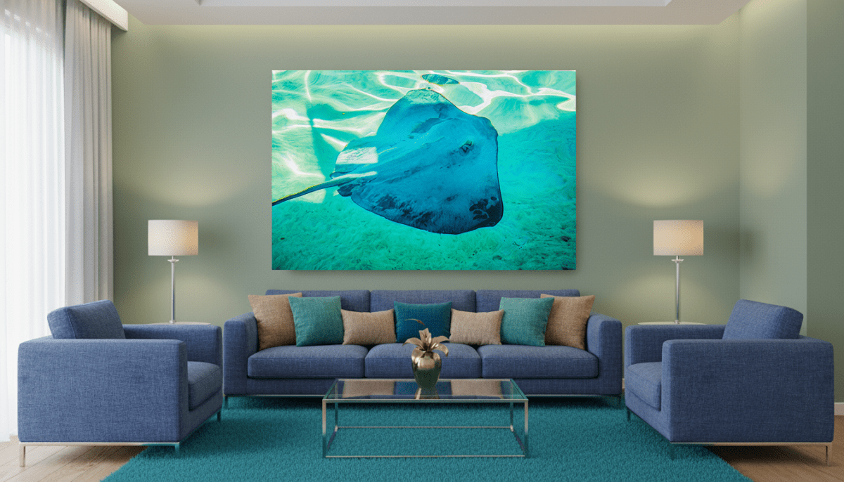 Sous la clarté mouvante de l’eau, une raie glisse avec une grâce silencieuse. Ses contours se fondent dans les reflets turquoise, dessinant une danse lente et apaisante. Cette œuvre capture l’essence d’un monde sous-marin où tout semble suspendu — la lumière, le mouvement, le temps lui-même.