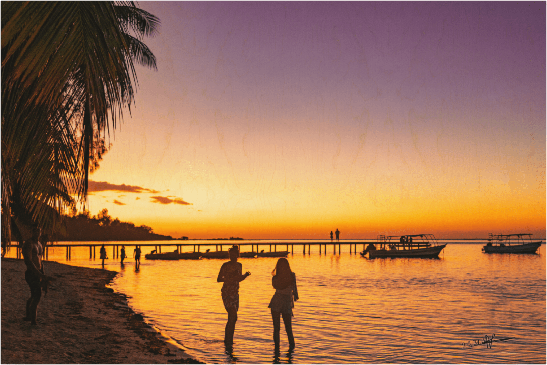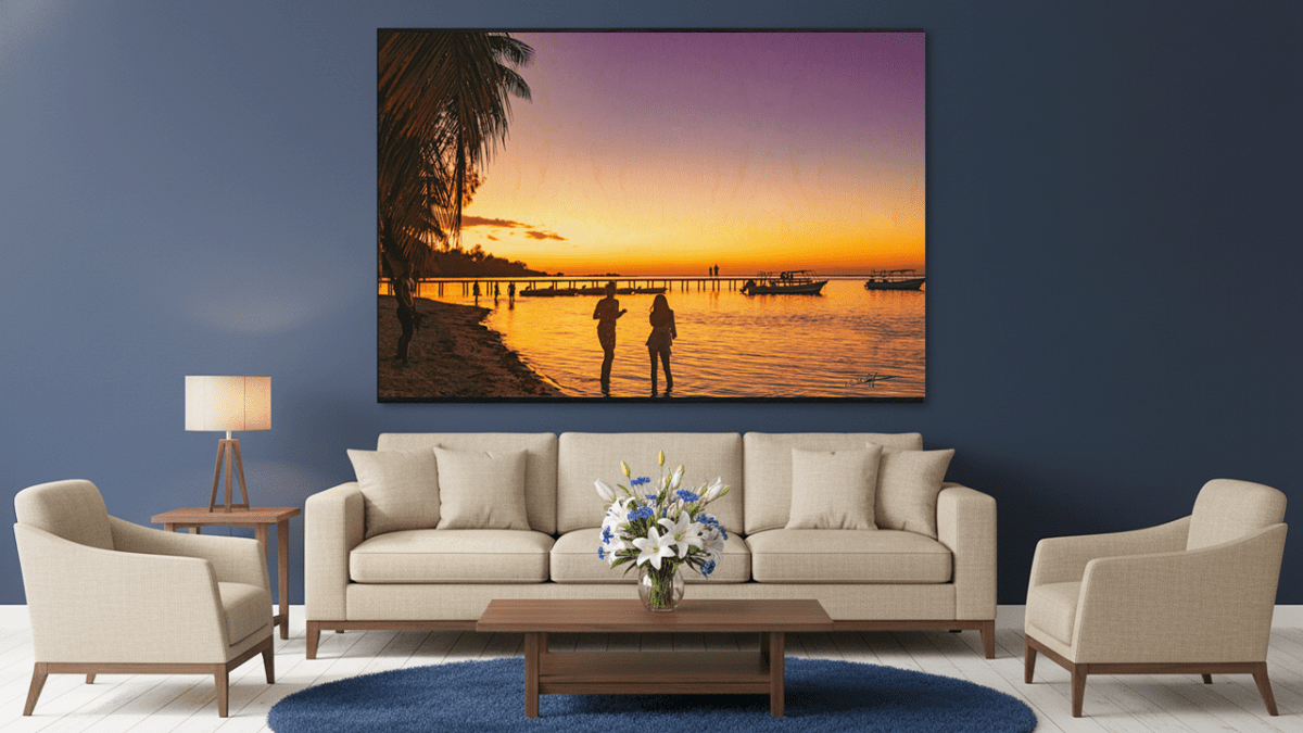 Avec Or sur l’Océan sur bois, le crépuscule s’ancre dans une matière naturelle et chaleureuse. Le grain du bois intensifie les reflets dorés et violets du ciel, et les silhouettes des bateaux et des palmiers semblent prendre vie sur la surface texturée. Chaque détail évoque la douceur d’un instant suspendu au bord de l’océan.