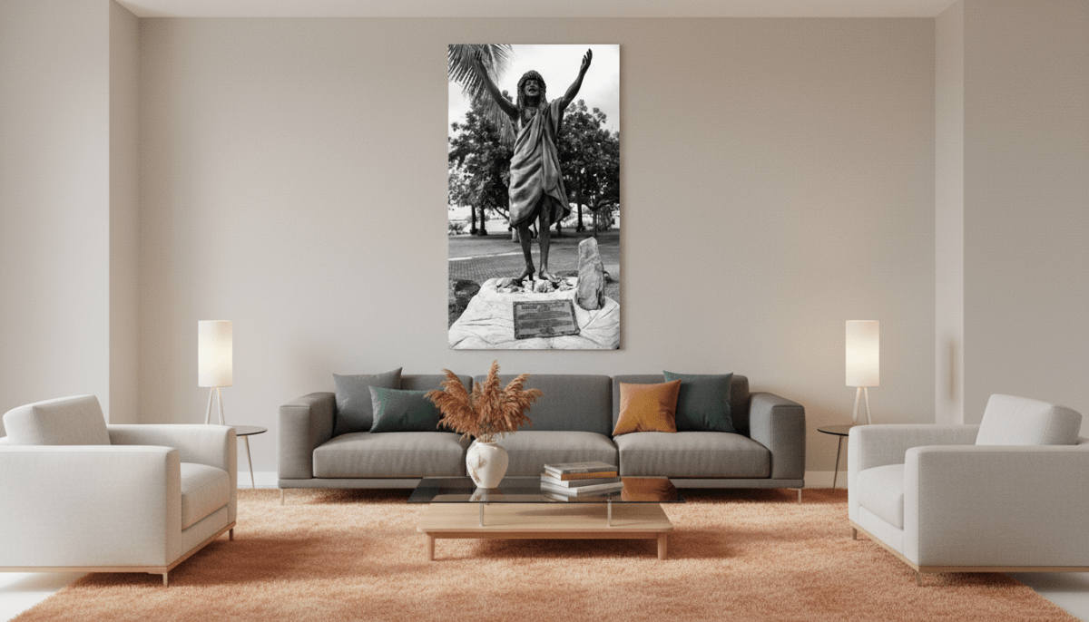Dans l’abri d’un horizon verdoyant, Souffle Polynésien s’épanouit comme un tableau décoratif peint sur toile, une fresque où la tranquillité s’éveille en douceur. Une statue majestueuse, gardienne de légendes anciennes, se tient fière, ses traits en noir et blanc fusionnant avec les palmiers qui dansent sous un vent léger. Cette scène, un souffle d’harmonie polynésienne, se déploie sur vos murs comme une caresse de paix.
