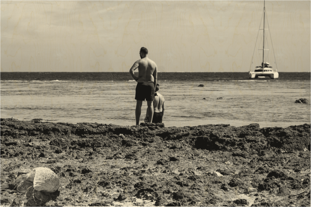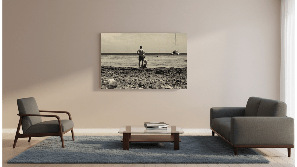Face à l'océan, sur le bois vivant, un homme et un enfant sont saisis dans un moment de contemplation pure, un voilier filant vers l'horizon. Vers l’Horizon, gravé sur panneau de bois, incarne une connexion brute à la nature et à l'essentiel, idéal pour une déco mural à l'âme vraie. Cette œuvre trouve sa place dans un intérieur qui honore le naturel et l'émotion.