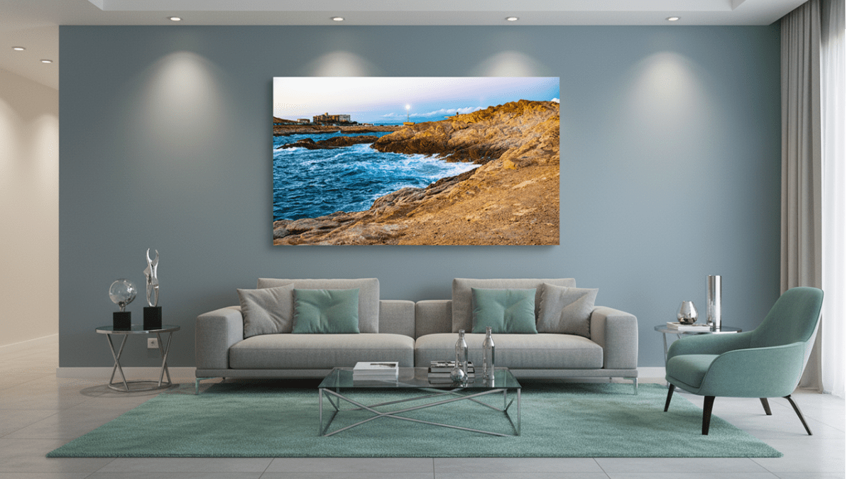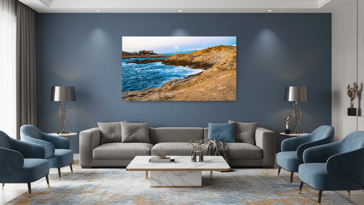 Le plexiglas donne à Rochers Dorés une luminosité et un contraste exceptionnels. Les reflets de l’eau et des rochers sous la lumière du crépuscule captent l’œil et créent une profondeur presque tridimensionnelle. La mer scintille et les nuances chaudes du ciel s’étendent jusqu’à l’horizon, offrant un tableau décoratif mural moderne et élégant.