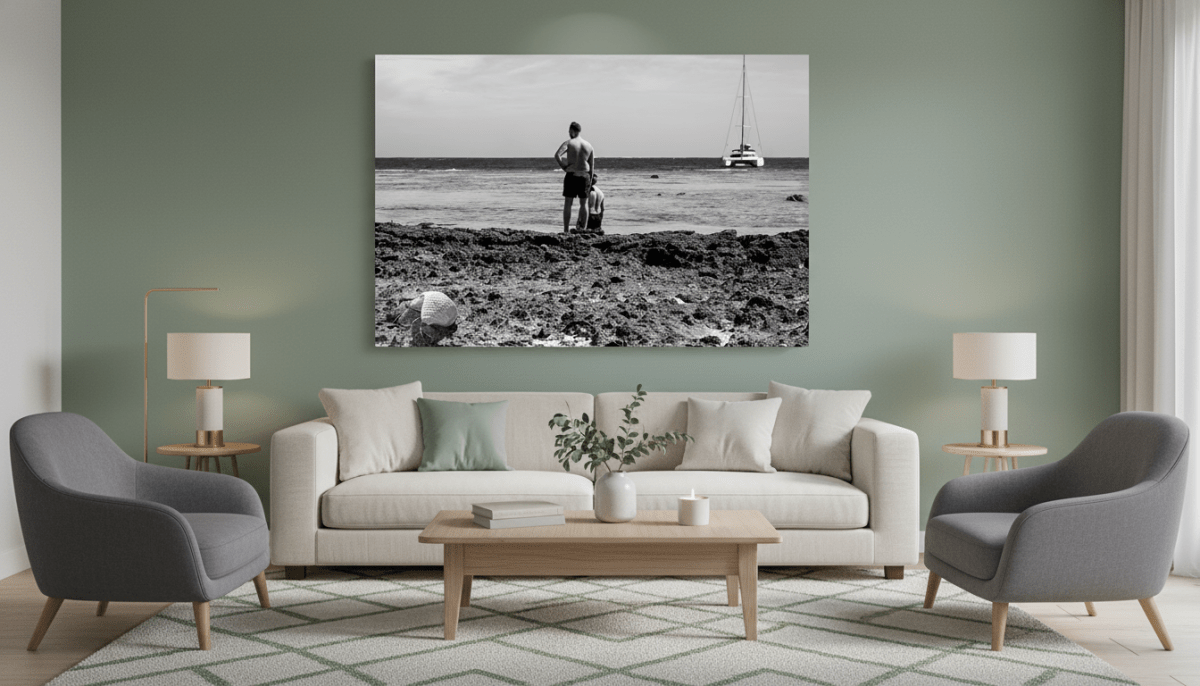 Sur vos murs se déploie un souffle marin, un instant suspendu où l’ombre d’un homme et d’un enfant se mêle aux reflets de l’océan. Vers l’Horizon sur toile murmure la douceur d’un vent léger, le frémissement des vagues et la promesse d’un voyage silencieux vers l’infini.