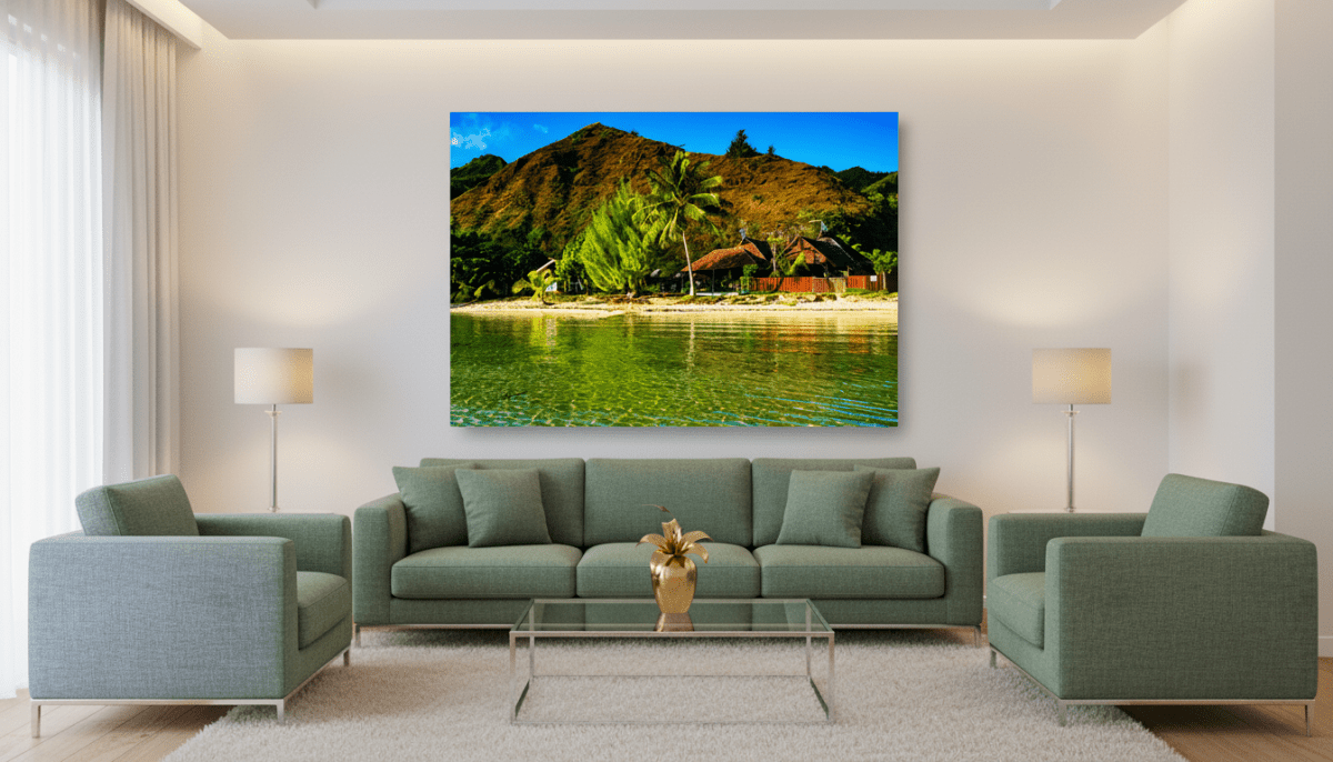 Un souffle de mer et de sable chaud s’invite sur vos murs. Vibration du Rivage sur toile révèle des cabanes aux toits rouges posées sur une plage turquoise, une colline verdoyante et un palmier solitaire veillant sur l’horizon.